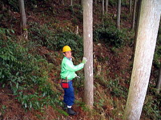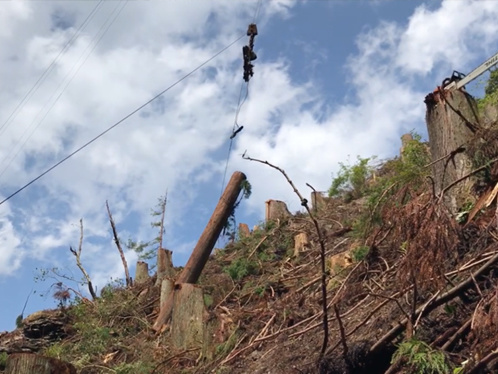 川口屋ではほぼ100%架線を張り、集材機を使って木をふもとまで下ろす方法を用いています。これを架線集材といいます。この架線の張り方によって仕事の効率が大きく変わってきます。