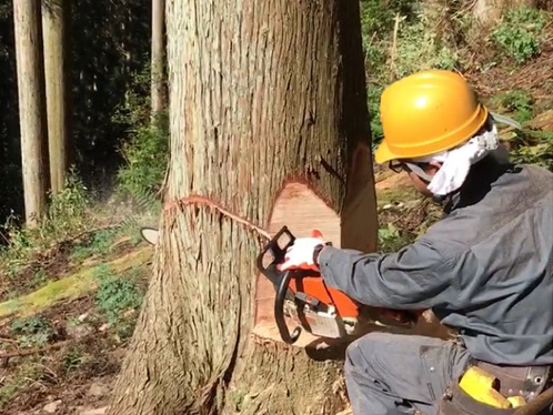 チェーンソーの他にもいろいろな道具を使って木を切ります。木を倒す方向も大変重要です。