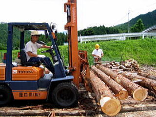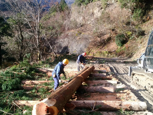 製材用に枝を綺麗に払い、適当な長さに切ります。木の形状や太さによって、最適な長さが違います。どうすればその木を1番生かせるかを心懸けます。(この作業は、集材前に山の中で行われる場合もあります)